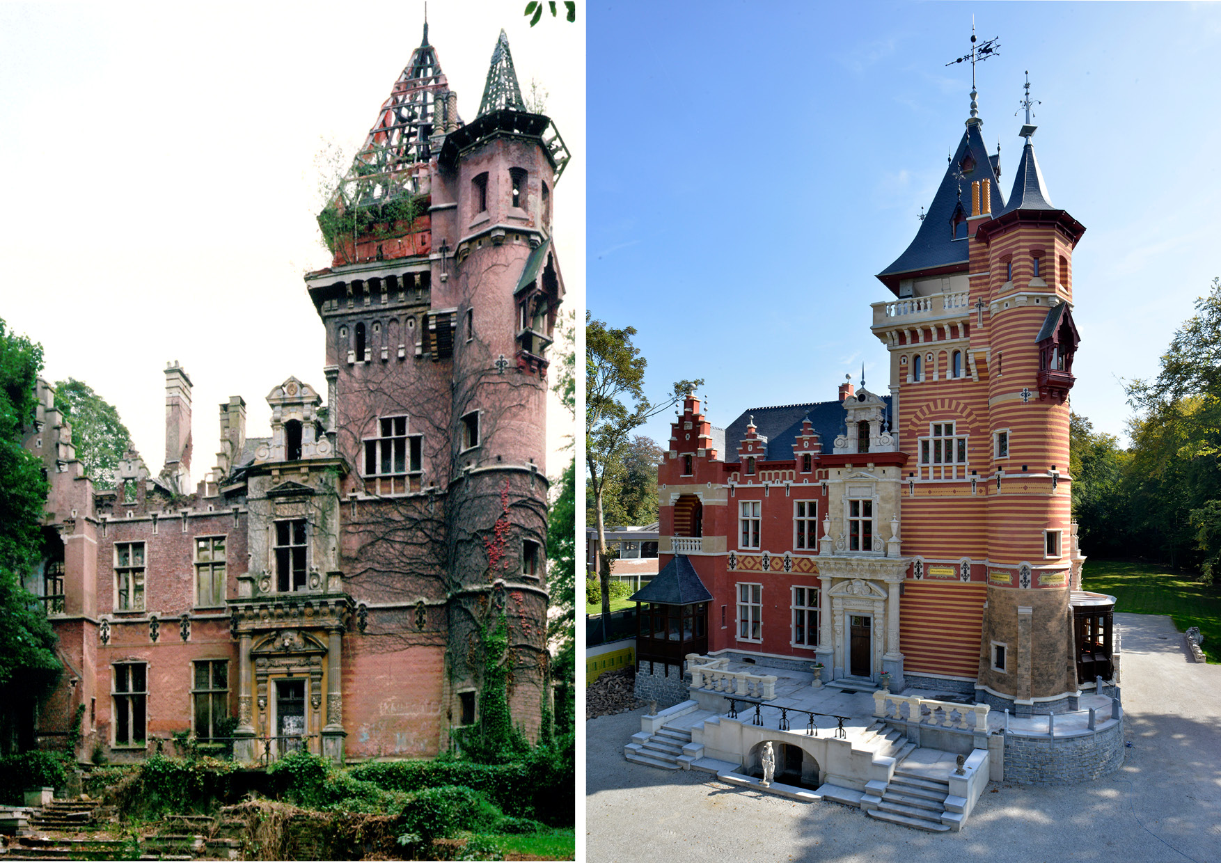 L'illusion n'est pas absente de ce projet où la brique se révèle peinte sur un enduit. Au fil du temps pourtant, la demeure ne séduit plus, au point qu'un siècle plus tard, elle n'est plus que l'ombre d'elle-même. Abandonnée, pillée, incendiée même, elle est malgré tout classée en 1988, ainsi que son site boisé à la lisière de la forêt de Soignes. Acquis par CODIC en 1990, le château fait l'objet de nombreux projets de réhabilitation, dont celui d'y accoler un bâtiment de verre pouvant accueillir 3.500 m² de bureaux (MA2-Art&Build). Aucun de ces projets n'a abouti. Le temps poursuit son œuvre jusqu'à ce qu'un « miracle » se produise en 2012 lorsqu' un investisseur espagnol se porte acquéreur du bien. Soucieux de le restaurer à l'identique et d'y établir sa résidence, il n'y prévoit pas d'extension, juste quelques bureaux. L'équipe de MA2 remet l'ouvrage sur le métier afin de reconquérir l'identité perdue de ce bâtiment remarquable. Paradoxalement, l'édifice réduit à l'état de chancre s'avère particulièrement bien documenté. Aux photos, plans et documents anciens, s'ajoutent analyses et sondages in situ. L'idée est de travailler comme un archéologue, de réinterpréter l'histoire, de recomposer le scénario. La philosophie de la restauration est mise en place, la reconstitution s'apparente à un travail sur l'écriture, comparable à celui mis en place par Charle-Albert à la fin du XIXe siècle.