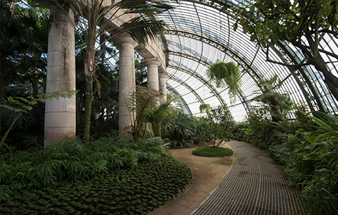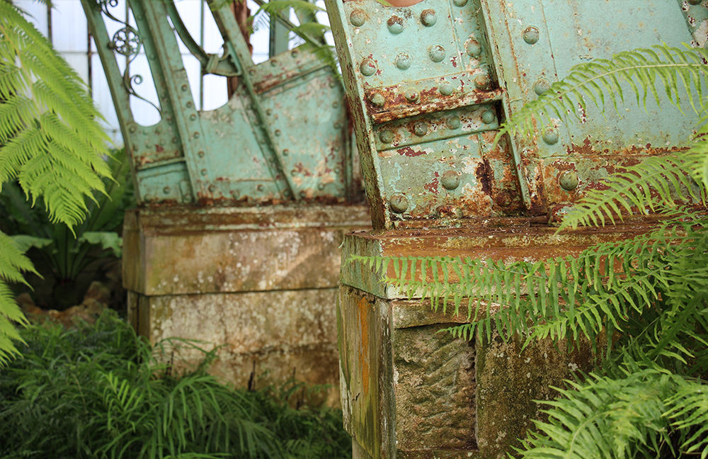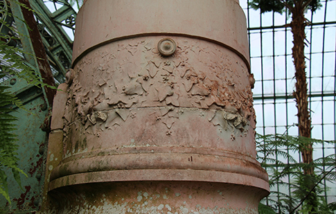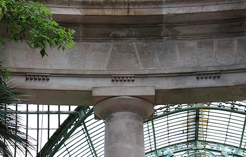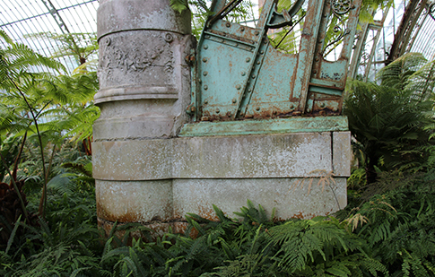 Un facteur accélère ces processus : l’humidité intérieure. À l’extérieur, l’édifice est soumis à la pluie et au ruissellement. À l’intérieur, en revanche, l’atmosphère chaude et humide produite par les plantes, l’arrosage et les sols engendre des phénomènes de condensation sur les parois vitrées et aux points froids de la structure. Ce microclimat enfermé sous verre est intrinsèquement corrosif. Il attaque les aciers, fragilise les protections et impose une vigilance permanente. C’est là une différence essentielle avec des édifices comparables comme le Grand Palais, qui appartient à la même famille constructive mais ne connaît pas un tel biotope intérieur.