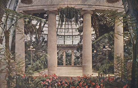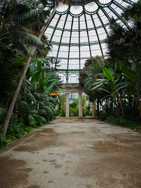 Sur le plan constructif, le Jardin d’hiver est un manifeste. L’édifice s’organise autour d’une coupole centrale reposant sur une colonnade de pierre, sur laquelle vient s’ancrer une charpente monumentale de fer forgé composée de trente-six grandes fermes métalliques, assemblées par rivetage. La coupole n’est pas un simple dôme. Sa géométrie est rythmée par des nervures convergeant vers un lanterneau central, dispositif à la fois lumineux et climatique, permettant l’évacuation de l’air chaud et la régulation de la lumière.